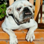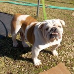 Adele lives with 2 fur brothers ( Ollie a Boxer and George a Yorkie) a foster sister, Boston Terrier Rosie and Zeke the cat.  She gets along beautifully with all of them but after watching her on Saturday, I think she needs some playtime with other bulldogs .  Her spirit is still in tack and after yesterday, I know she doesn’t spook from loud noises.  My son came over to do some trim work for me and the sounds of a chop saw, compressor and nail gun didn’t seem to phase her.  I think she could be a good dog to tag along on a construction site.  Gives a new meaning to “mechanical bull”!!!