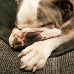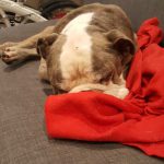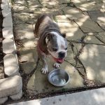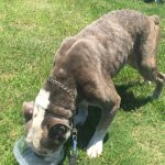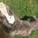 At first he had some trouble adjusting with his foster sister and brother who are also bullies. There were a few scuffles as he tried to establish dominance over them. However at day 4, we are seeing less of this kind of behavior towards his foster bulldog siblings. He does, however, get tense around his foster sister black lab and has lunged at her a few times. It’s possible while his was used as a dog bait, our black lab reminds him of his horrible past. We are eventually planning on getting him used to her too around the house, but as of now they are separated. It may be that he’s very curious by her? He hasn’t showed food aggression towards the dogs but we haven’t really put him to the test yet.