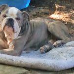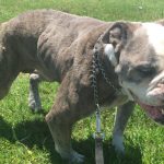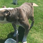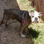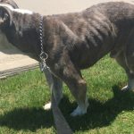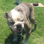 7/10/16 Update: Andrew has overcome MANY horrible challenges in his short past. When we went to pick him up, the vet wanted to talk to us first before bringing him out. He told us that he was SEVERELY underweight, infected with the worst case of parasites he had ever seen, ridden with scars as if he was a bait dog and severe joint issues, including arthritis and possible torn ligaments. The vet said the injuries suggest that he was thrown out of a moving car in the past. And if that’s not enough suffering, the vet informed us he has a pellet lodged in his chest from being shot. The vet then proceeded to get Andrew as we waited in the exam room. What we saw next was heartbreaking. Andrew came in looking like a bag of bones supporting a big bully head. And that’s with the 10 pounds he has gained while being boarded at the vet. It’s hard to say what he is as he is taller than your typical bulldog. The vet thinks he’s a bulldog mix or a product of bad backyard bulldog breeding. Either way, it doesn’t matter because he’s cute as a button!
