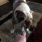 3/27/26 Update: We have had Angus for about a week now, and this big boy is an absolute doll! He gets so excited when we come home ~ he grabs his toys and just runs like a maniac throughout the house. He also gets along great with our other dogs. We haven’t figured out if he is hard of hearing, or if he just has Bulldog selective hearing. We have noticed a few noises and sounds he does not respond to. But you put food in his bowl, and boy, he can hear that from a mile away! He is potty trained and will scratch at the door when he wants out or back in. He is just a big ol’ clown that loves to play!