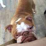 As you can see, my eye is infected. I have been getting drops twice a day and it still looks pretty bad. I am going back to Dr. W this week, so he can check it out. I will need drops in my eyes for the rest of my life. I am strong and don’t really like the drops so I will give you a pull and a tug, but I will let you put them in. I am only 2 years old and weigh 57 pounds. I love to play and jump, but also like to lounge and sunbathe. My foster sister, Olive, is teaching me to run and rumble in the backyard. It is a blast. I don’t mind a bath, but please get that face washing over with quickly!
