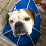 9/25/16 Update: This week we welcomed Daisy into our home. She was found as a stray, and from the scars on her body and bad condition of her skin this girl has had a rough life, but you would never know it from how she acts. She is sweet as can be, follows people or other pups around the house just wanting love and attention. When you look into this girl’s eyes all you see is longing: longing to be touched, longing to be loved, longing to be cared for! It is easy to do all of those things for Daisy and the absolute love she gives back is amazing!(She will NOT wear her blue cone the right way! We’ve tried countless times.
