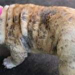 Here is what we do know about Susie Q. Yes, that one from the CCR hit, “Oh, Susie Q, baby I love you, Susie Q.” That’s exactly how I feel about this girl! She is 2 years old and weighs 34 pounds. She has what appears to be a C-section scar and it looks like she has spent her life outside and on concrete. She was covered with fleas and ticks, has pyoderma and has bare spots all over. The bald spots are the result of a yeast infection run amuck.