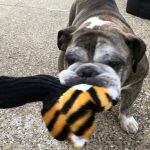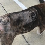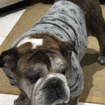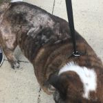 Vinny has been adopted!  From his foster… I mean, FUREVER momma: One day, back in June 2017, we were looking at the Bulldog website and contemplated adding another Bulldog to our family. We already had two girls, RoseBud and Lady Violet, but we fell in love with a sad-looking, skinny, bald, brindle boy. He had been found wandering the streets in the heat of summer and the rescue group had named him Vinny.