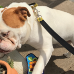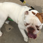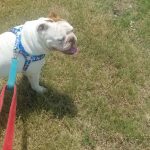Foster mom and Foster dad also said that I need a help learning how to walk on leash. I thought grabbing the leash with teeth and tugging was fun but they didn’t agree. They can be a little boring sometimes but they said these “new rules” are good for me. I also showed them this cool trick I can do where I can back flip out of any harness they tried to put on me. Foster mom said she had never seen a bulldog do that before so I must be pretty impressive. But, you know foster mom and dad didn’t look too impressed as they chased me around the pasture trying to catch me. I thought we were playing tag but apparently they didn’t think that would be a fun game. Oh well, once they caught me they still gave some loving and said no more harness for you, you get a collar. I like my collar better, it’s blue. I’ve been getting to go for walks twice a day before it gets too hot out and late in the evening. Foster mom says that helps me burn off a little of my extra energy and work on walking on a leash at the same time. I get some one on one time with one of the parentals so I think it’s cool.